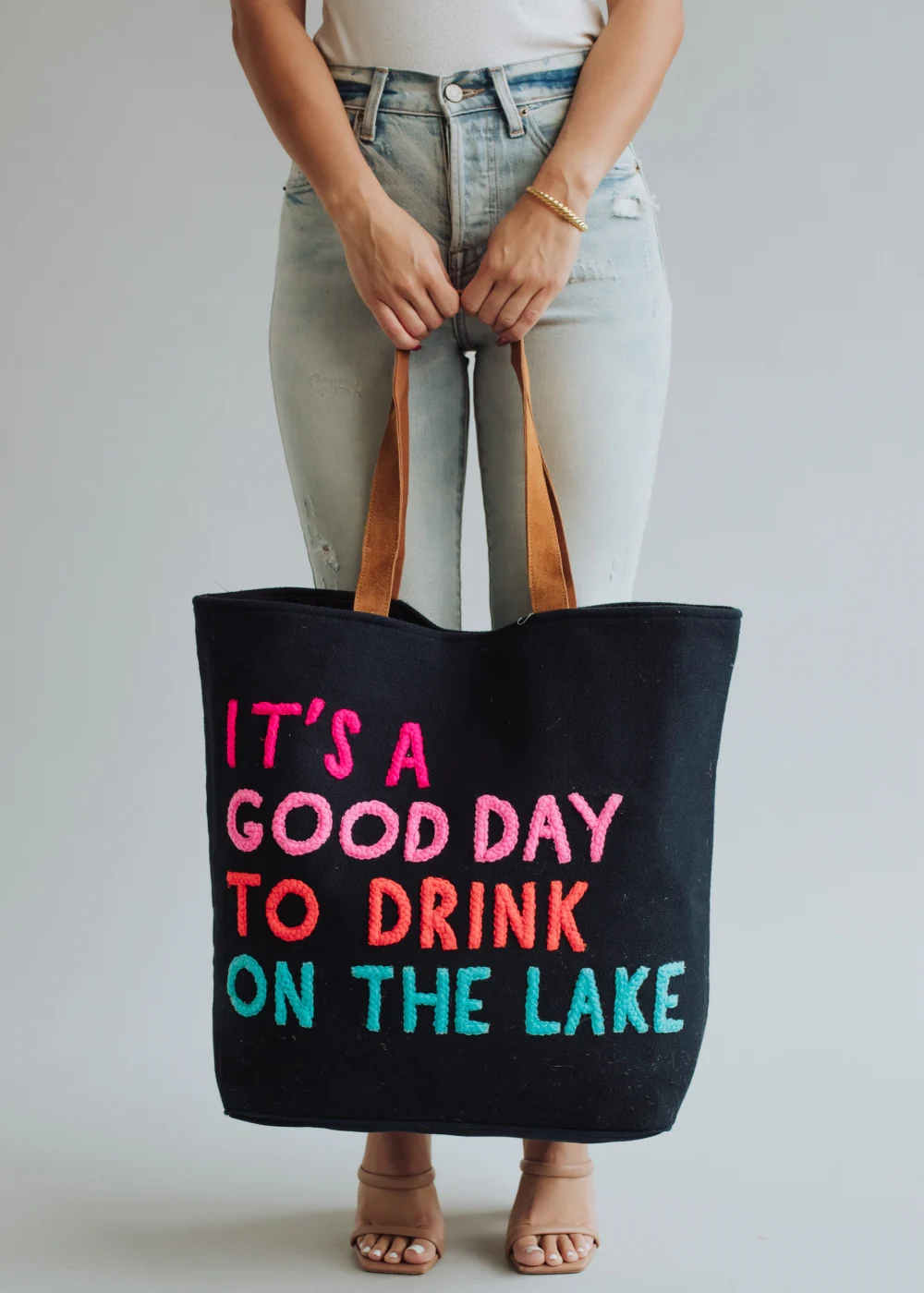 - Multicolored "It's a good day to drink on the lake" text on the front